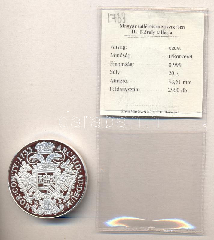 Magyar tallérok utánveretben "III. Károly Tallérja 1733." Ag (0,999) 20g T:PP Tanúsítvánnyal, csak 2000db!