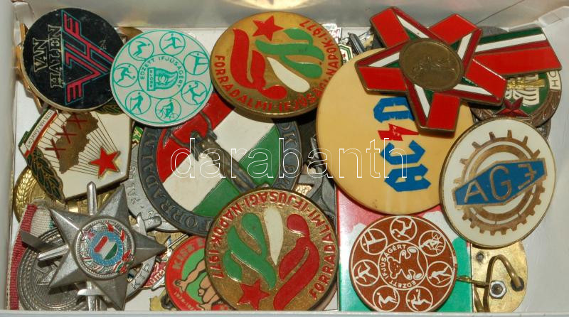 Kis doboznyi vegyes kitűző és jelvény, benne militária vonatkozásúak i...