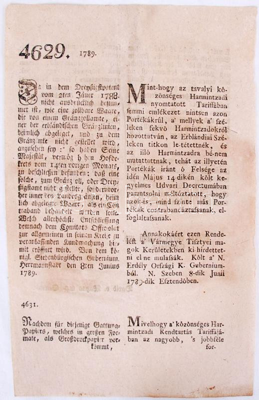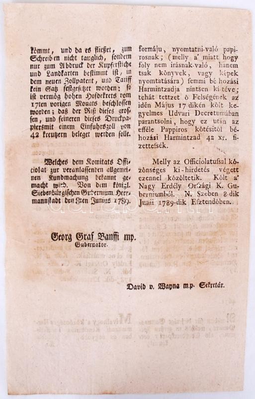 1789 Bánffy György (1746-1822) erdélyi kormányzó kétnyelvű rendelete harmincad ügyében