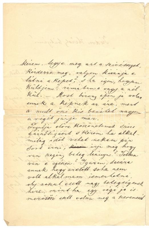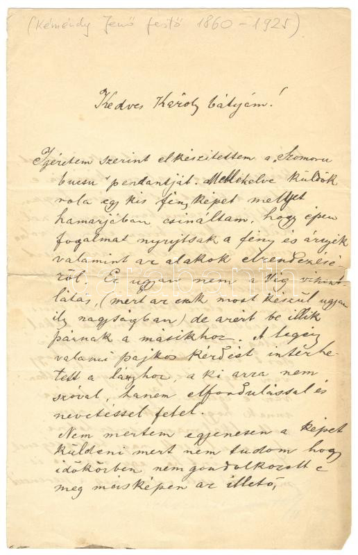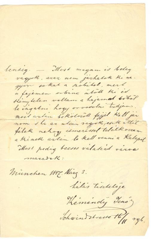 1884 Keméndy Jenő festőművész saját kézzel írt levele Münchenből, melyben beszámol a Szomorú búcsu c. képe megfestéséről, valamint betegségéről 3 beírt oldal