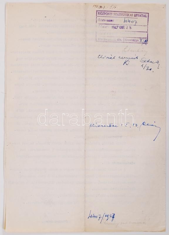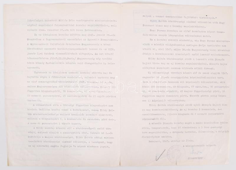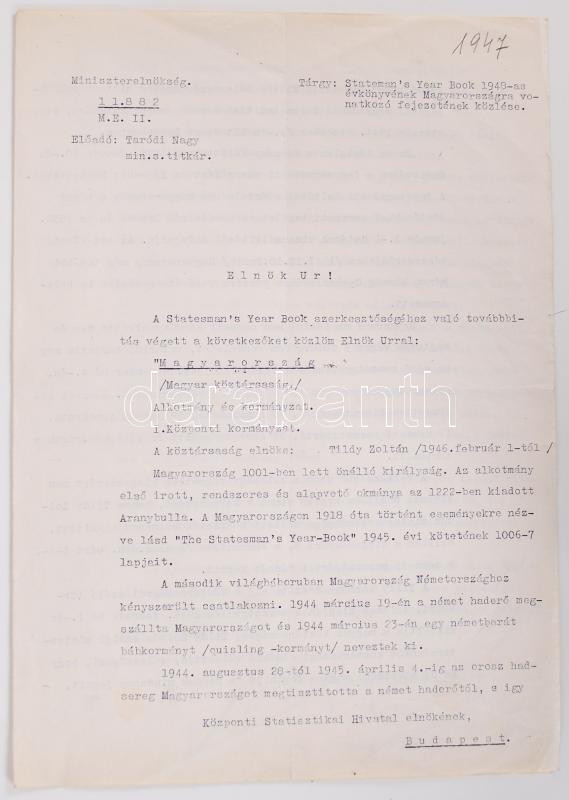 1947 A magyar miniszerelnökség levele a Statesman' Year Book c. diplomata-információs évkönyvbe. Információk a Magyarországra vonatkozó szócikkhez. 3 gépelt oldal a miniszterelnökségi államtitkár aláírásával