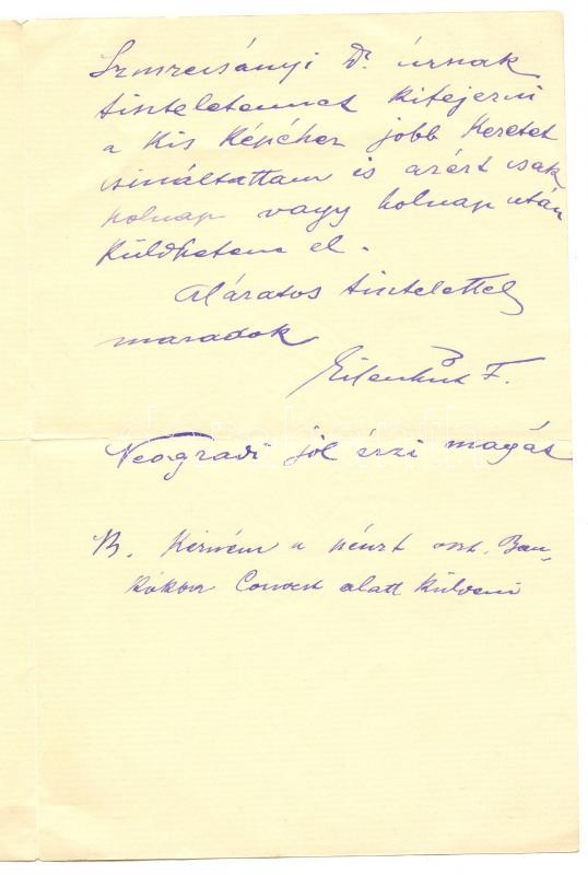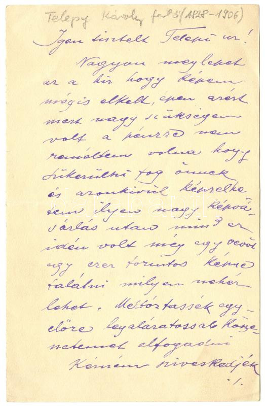 cca 1890 Eisenhut Ferenc festőművész saját kézzel írt levele Telepy Károly festőnek, melyben köszönetét fejezi ki a festőnek, hogy eladta egy képét