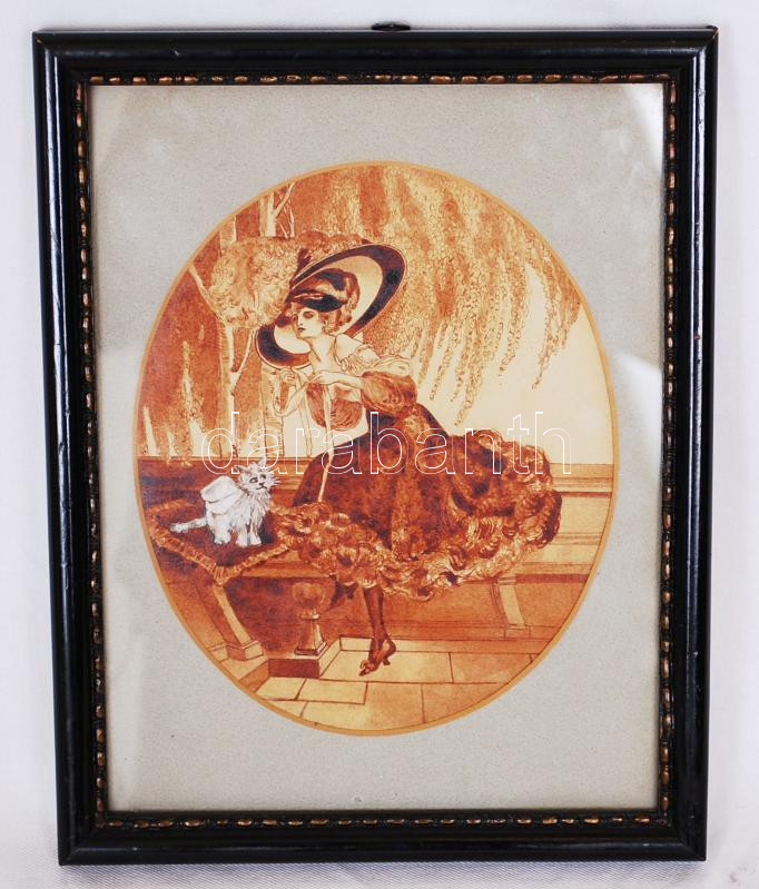Jelzés nélkül: Kalapos kandúr és a dáma. Tus, karton, szép régi keretb...