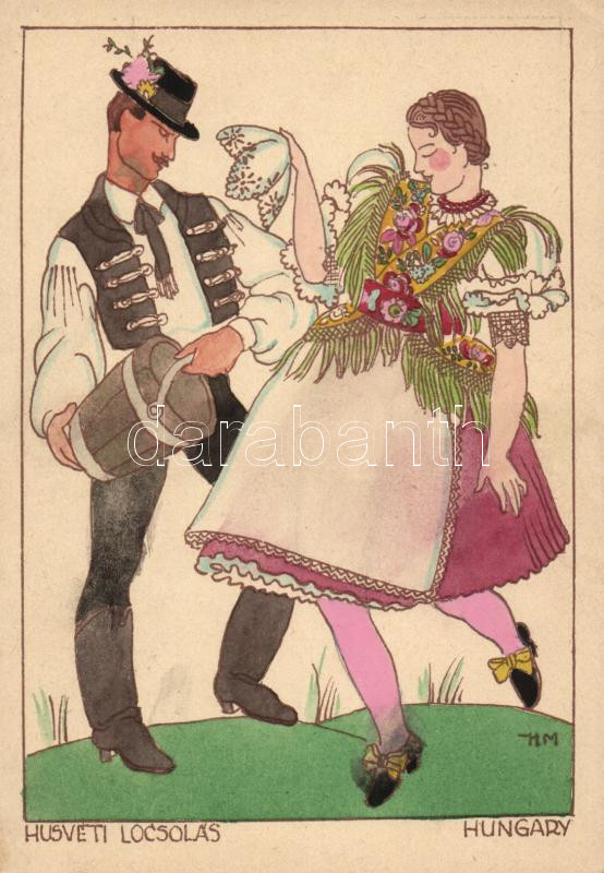 Húsvéti locsolás / Easter, Hungarian folklore, hand-painted postcard s...