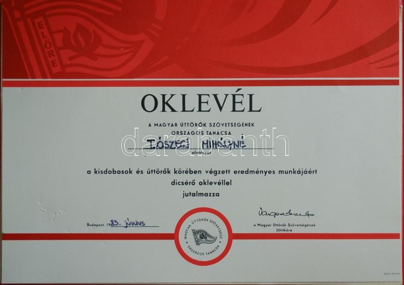 1952-1983. 3db szocialista kitüntetés adományozói okirata: "Magyar Népköztársasági Érdemérem arany fokozata" + "A Haza Szolgálatáért Érdemérem arany fokozata" + "Magyar Úttörők Szövetségének Országos Tanácsa" dicsérő oklevele és kitüntető jelvénye műbőr tokban