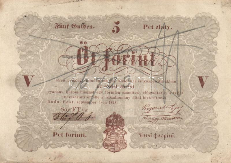 1848. 5Ft "Kossuth-bankó" barna, hátlap barna keretnyomat és fekete sz... https://www.darabanth.com/en/175-Online-auction/175.0/Numismatics/Hungarian-Banknotes~1200086/1848-5Ft-Kossuth-banko-barna-hatlap-barna-keretnyomat-es-fekete-szoveg-a-bankjegy-grafit-ce~II607709