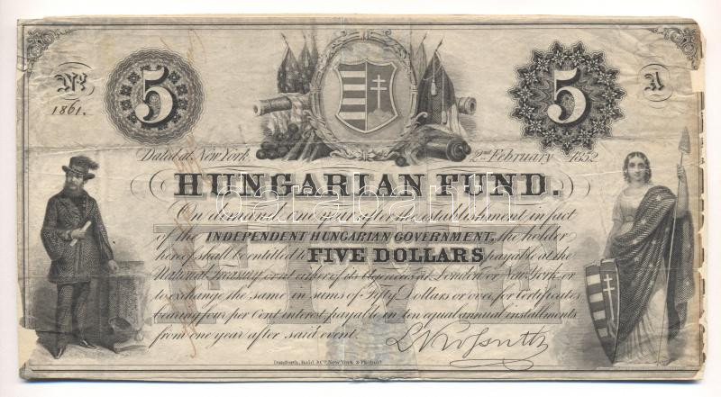 1852. 5$ "A" "Kossuth bankó" fekete számozással "Adolphe Gyurmán" függ... https://www.darabanth.com/en/175-Online-auction/175.0/Numismatics/Hungarian-Banknotes~1200086/1852-5USD-A-Kossuth-banko-fekete-szamozassal-Adolphe-Gyurman-fuggoleges-alairasaval-~II605373