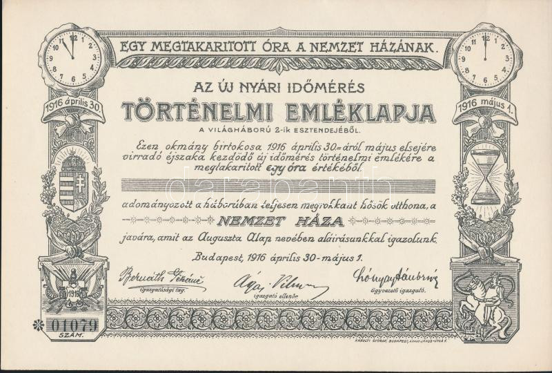 1916. Az új nyári időmérés Történelmi Emléklapja, kitöltetlen