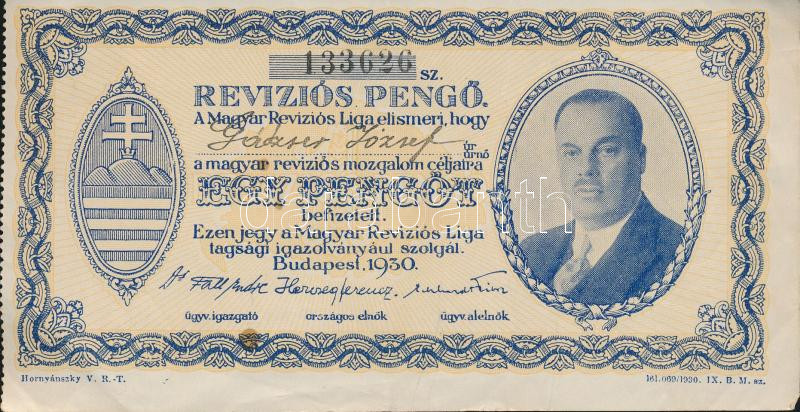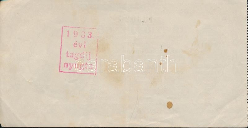 Budapest 1930. "Revíziós Pengő" arcképes változat, kitöltött "1933. évi tagdíj nyugta" hátoldali pecséttel T:II-