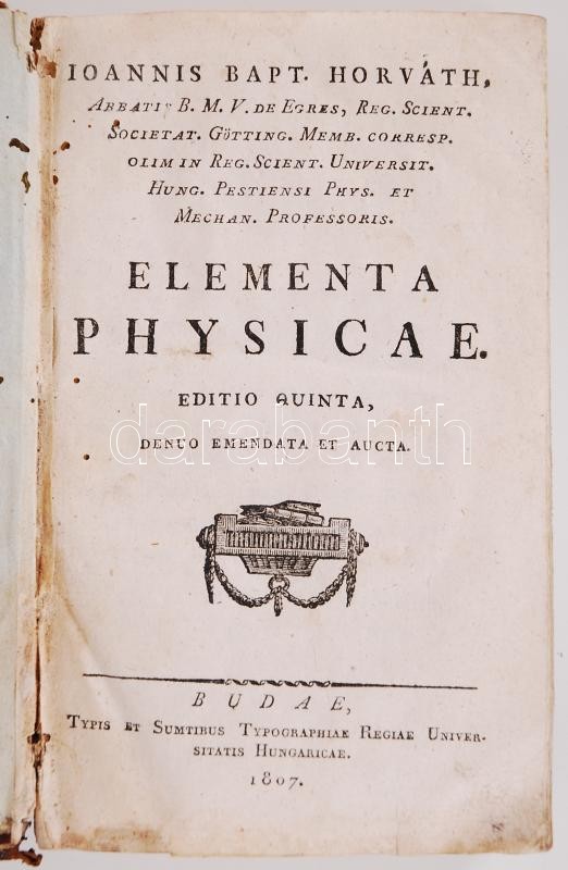 Joannis Bapt. Horváth: Elementa physicae. Editio quinta, denuo emendat... https://www.darabanth.com/en/175-Online-auction/175.0/Other-collectibles/Books-Science~1000036/Joannis-Bapt-Horvath-Elementa-physicae-Editio-quinta-denuo-emendata-et-aucta-Budae-1807-Typi~II603899