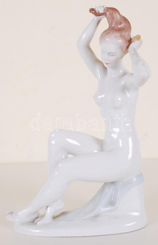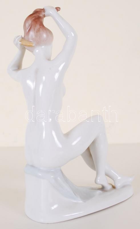 Aquincum, fésülködő női akt, kézzel festett, jelzett /Handpainted Aquincum chinaware nude figure 22cm