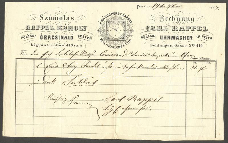 1857 Budapest V. Rappel Károly óracsináló számla / Clock maker invoice
