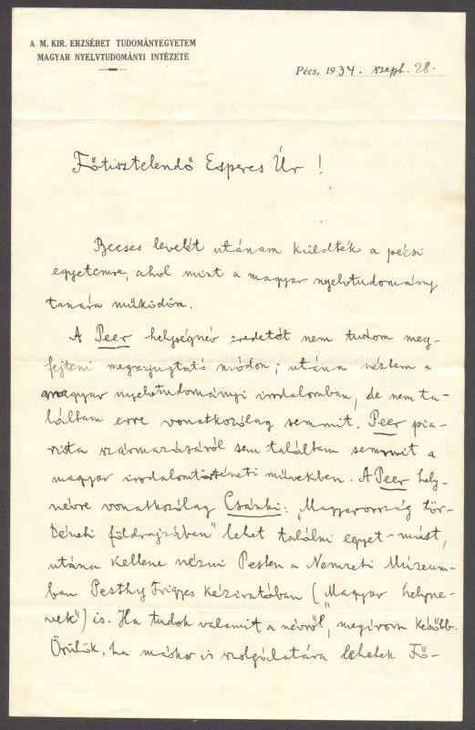 Description: 1934 Klemm Antal nyelvész, finnugrista saját kézzel írt Főtisztelendő Esperes Úr megszólítással kezdődő levele, melyben a Peer helység nevének eredetéről értekezik. Egy beírt oldal