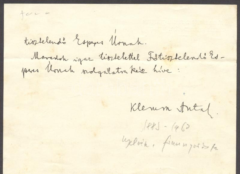 1934 Klemm Antal nyelvész, finnugrista saját kézzel írt Főtisztelendő... https://www.darabanth.com/en/175-Online-auction/175.0/Other-collectibles/Historical-documents-manuscripts~1000019/1934-Klemm-Antal-nyelvesz-finnugrista-sajat-kezzel-irt-Fotisztelendo-Esperes-Ur-megszolit~II604424