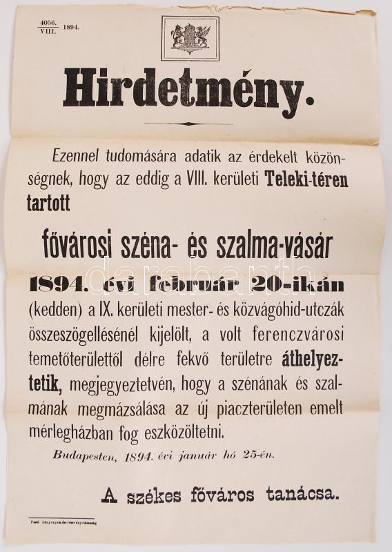 1894 Fővárosi széna vásár a Teleki téren falragasz 30x45 cm