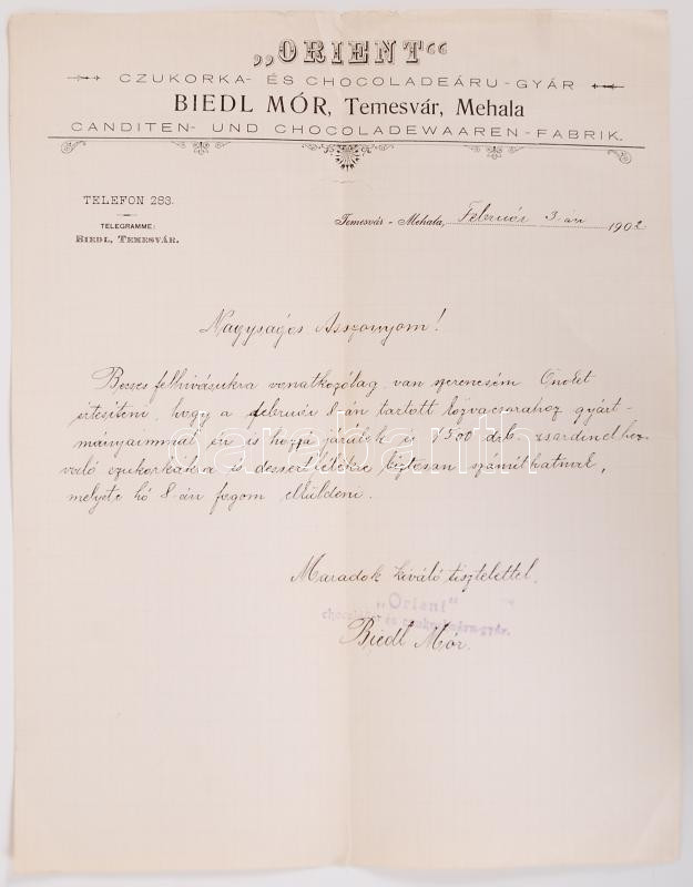 https://www.darabanth.com/en/175-Online-auction/175.0/Other-collectibles/Printed-Materials~1000044/1902-Temesvar-Biedl-Mor-csokoladegyar-fejleces-level-Chocholate-factory-fejleces-level~II608872