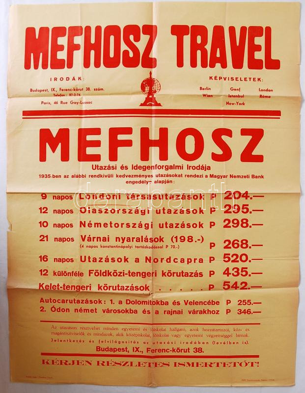 1935 MEFHOSZ utazások plakát 50x70 cm