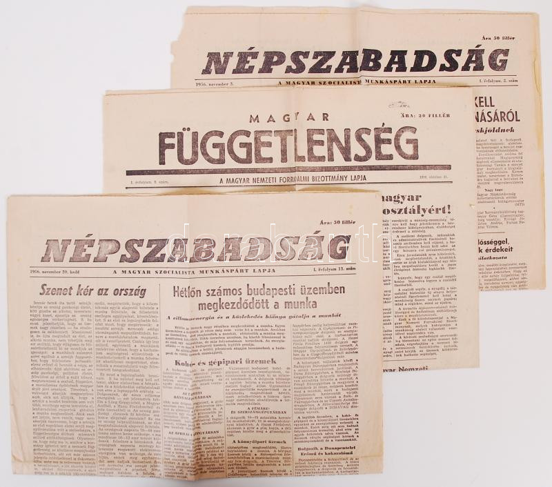 1956 Újságok a forradalom híreivel 5 db: Népszabadság nov 3, 12, 20, Népszava okt 29, Magyar Függetlenség okt 31