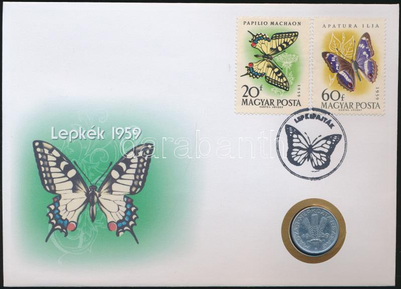 1959. 20f "Lepkék 1959" érmés bélyeges boríték alkalmi bélyegzővel és bélyegpárral T:3
