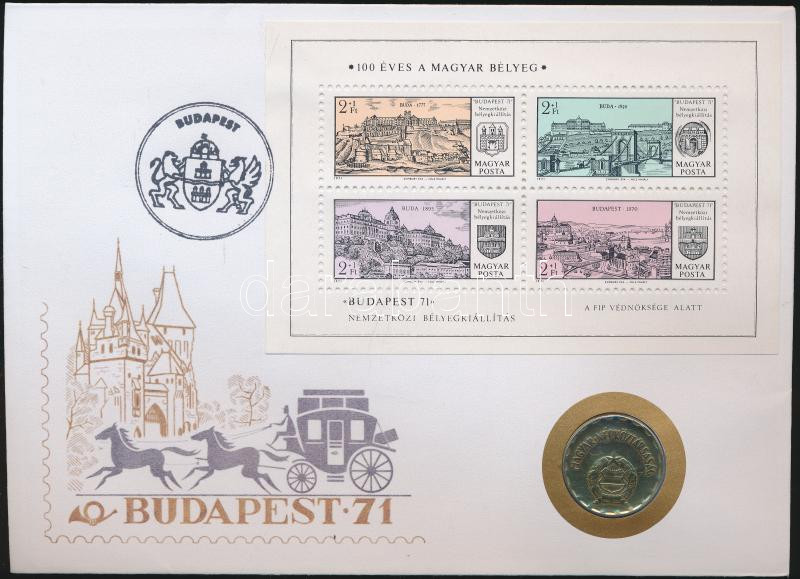 1971. 2Ft "Budapest 71 - 100 éves a magyar bélyeg" érmés bélyeges boríték alkalmi bélyegzővel és bélyegblokkal T:2