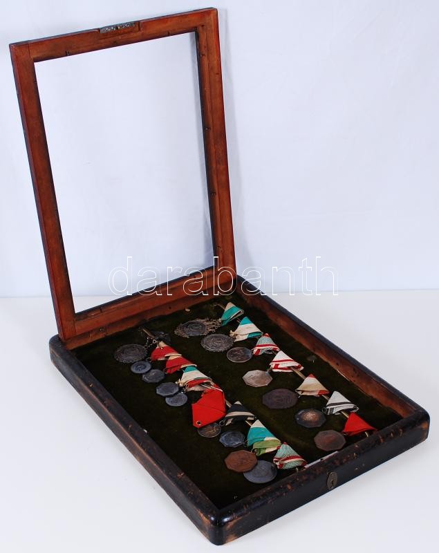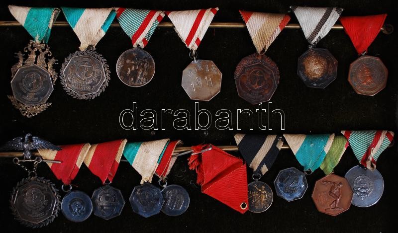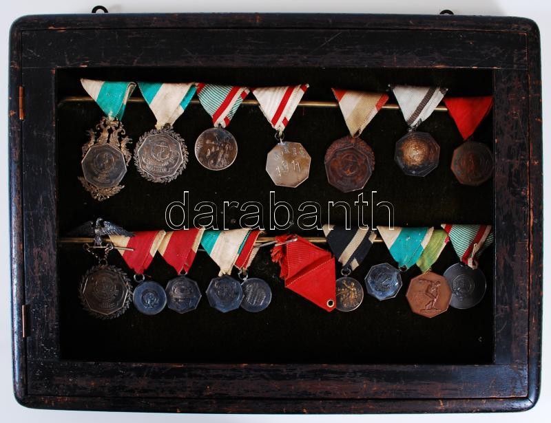 Dekoratív vegyes "Kerékpár Kör" (15x) + Súlylökés (1x) díjérem tétel, közte 7db ezüst medállal, mellszalaggal és díszes darabokkal, antik falra akasztható fa vitrinben (üveglap hiányzik) T:vegyes