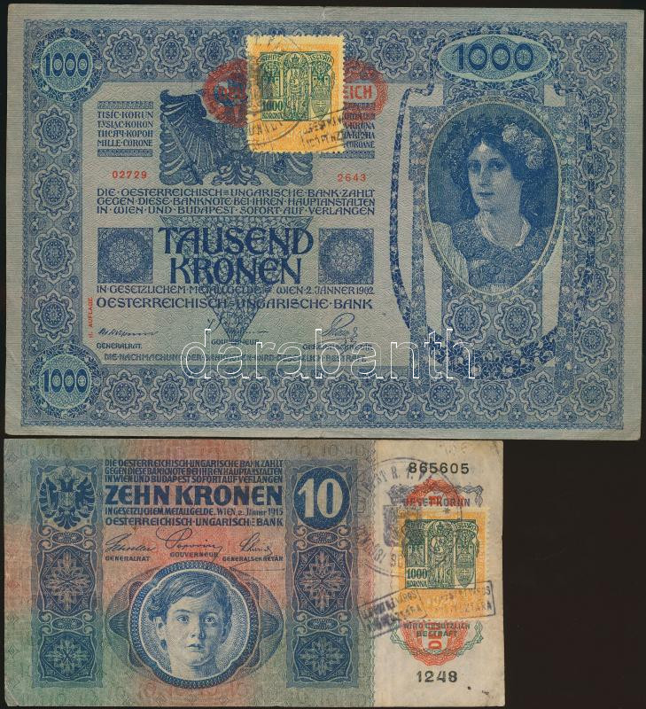 1902. 1000K + 1915. 10K, mindkettő 1923-as 1000K-ás bélyeggel és pecséttel T:II-,III