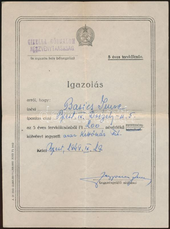 1949. "Gizella Gőzmalom Részvénytársaság" igazolás 200Ft értékű jegyzett nyereménykötvényről T:III