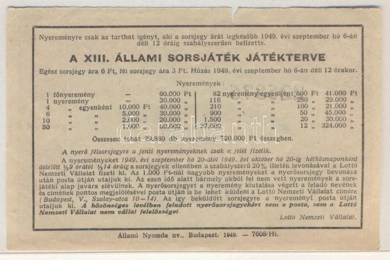 1949. "XIII. Állami Sorsjáték" fél sorsjegy T:hajtatlan, kis papírhián...