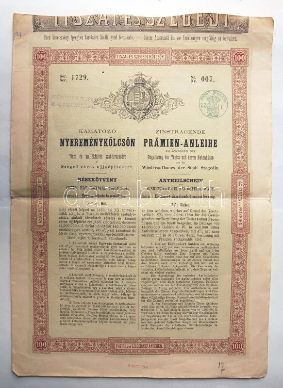 Budapest 1880. "Kamatozó Nyereménykölcsön Tisza és mellékfolyói szabál... https://www.darabanth.com/en/177-Online-auction/177.0/Numismatics/Shares-and-Tickets~3300026/Budapest-1880-Kamatozo-Nyeremenykolcson-Tisza-es-mellekfolyoi-szabalyozasara-es-Szeged-~II624250