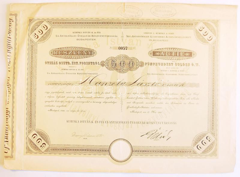 Budapest 1886. "Kuhinka István és Fia Új-Antalvölgyi Üveggyár Részvény... https://www.darabanth.com/en/177-Online-auction/177.0/Numismatics/Shares-and-Tickets~3300026/Budapest-1886-Kuhinka-Istvan-es-Fia-Uj-Antalvolgyi-Uveggyar-Reszvenytarsasag-Budapesten~II624031