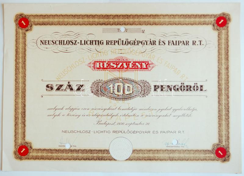 https://www.darabanth.com/en/177-Online-auction/177.0/Numismatics/Shares-and-Tickets~3300026/Budapest-1930-Neuschlosz-Lichtig-Repulogepgyar-es-Faipari-RT-reszvenye-100P-rol-lyukasz~II624060