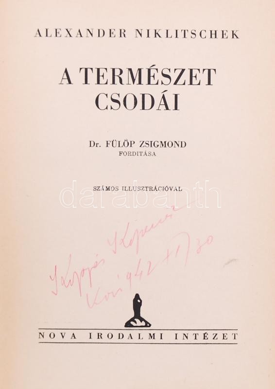 Alexander Niklitschek: A természet csodái. Ford. dr. Fülöp Zsigmond. B... https://www.darabanth.com/en/177-Online-auction/177.0/Other-collectibles/Books-Science-and-thechnology~200027/Alexander-Niklitschek-A-termeszet-csodai-Ford-dr-Fulop-Zsigmond-Bp-1942-Nova-Irodalmi-In~II607095