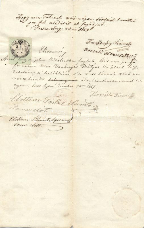 1857 Elismervény 5fl. C.M. okmánybélyeggel