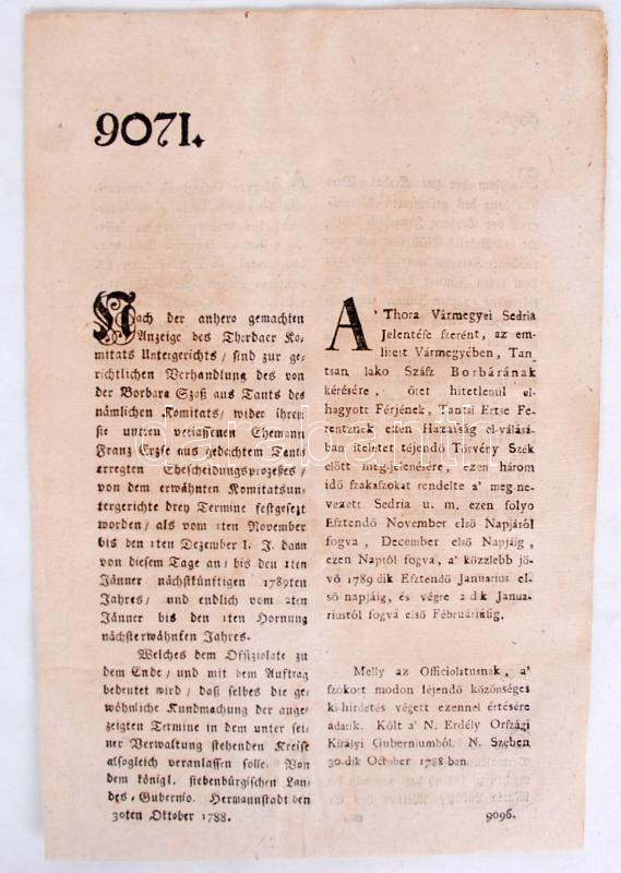 1788 Bánffy György (1746-1822) erdélyi kormányzó kétnyelvű körlevele peres ügyekben