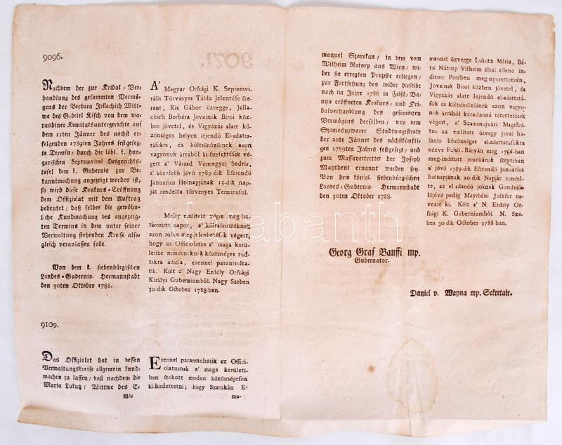 1788 Bánffy György (1746-1822) erdélyi kormányzó kétnyelvű körlevele p...