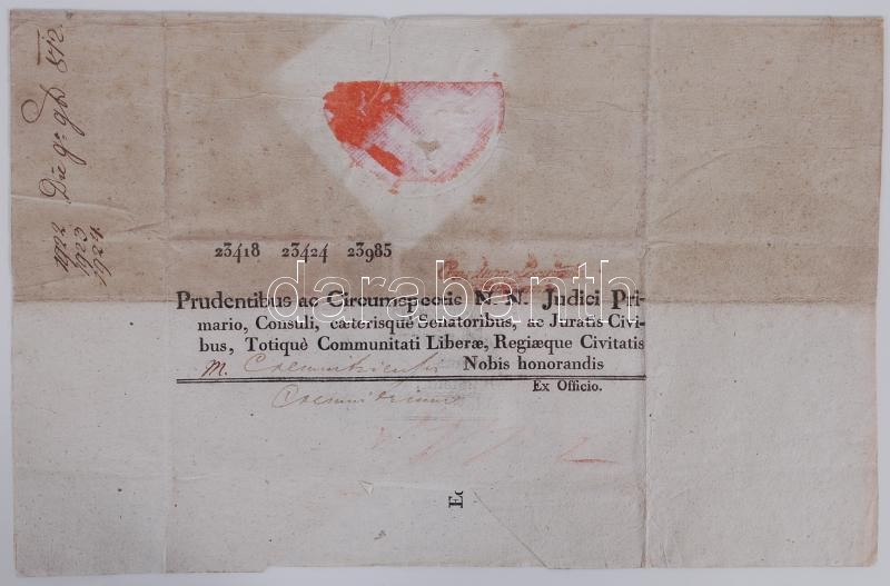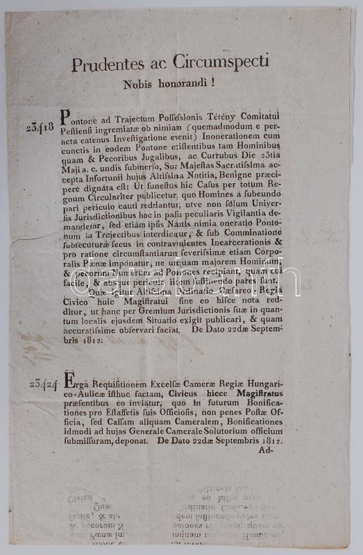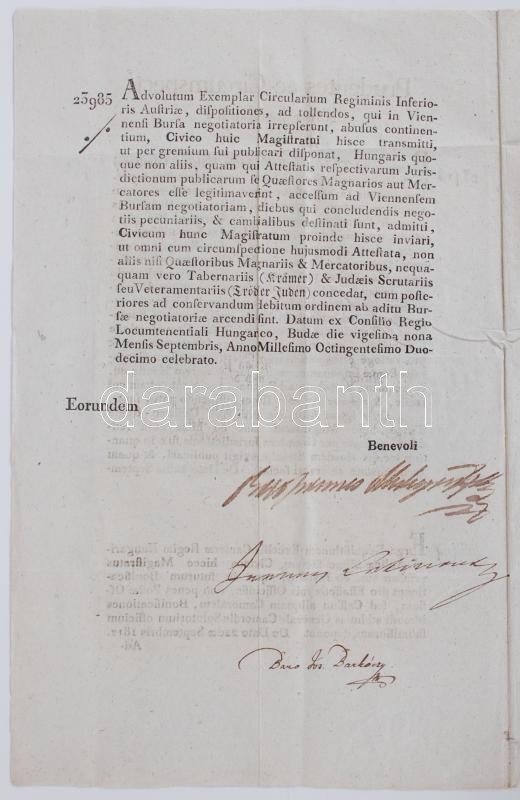 1820 Helytartótanácsi levél I. Ferenc császár hajózásról és kereskedlemről szóló rendeletével Mednyánszky János báró, Bécs-hű főúr, tanácsos, Latinovics János és Barkoczy János helytartótanácsi titkár saját kezű aláírásaival / Ex offo letter of the Governing Council including ship order with autograph signatures 2 p.