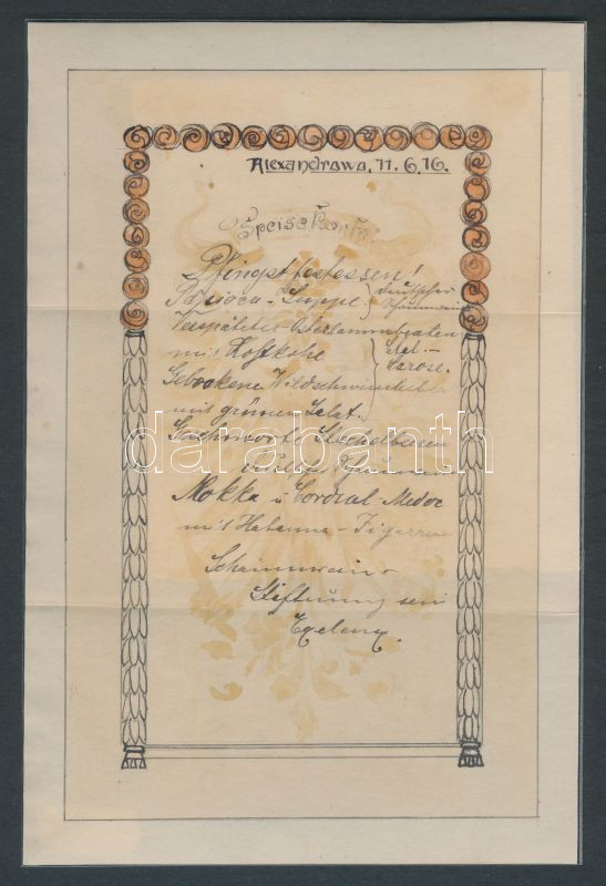 https://www.darabanth.com/en/177-Online-auction/177.0/Other-collectibles/Historical-documents-manuscripts~200015/1916-Alexandrowa-hadifogolytabor-kezzel-irt-punkosdi-unnepi-menukartya-Hand-written-menu-c~II469973