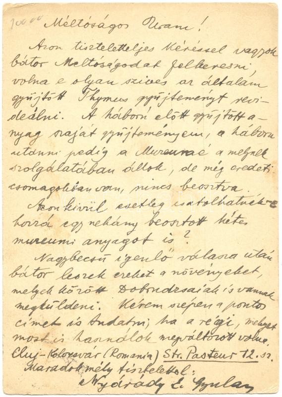 Nyárády Erazmus Gyula botanikus Lyka Károlynak írt levelezőlapja, melyben felkéri botanikai gyűjteményének felülvizsgálatára