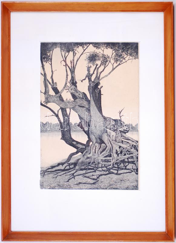 Nyári Lóránt (1928-1982) Papszigeti fák (1975). Rézkarc, papír, jelzett, üvegezett keretben, 62×45 cm
