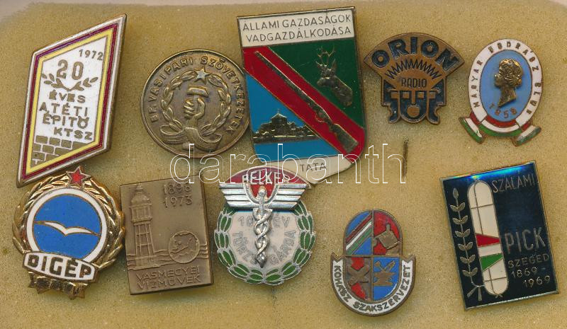 10db különféle zománcozott jelvény, közte pl.: "Magyar Fodrász Club 1958", "Kohász szakszervezet" + "20 éves a Téti Építő KTSZ" T:1,2