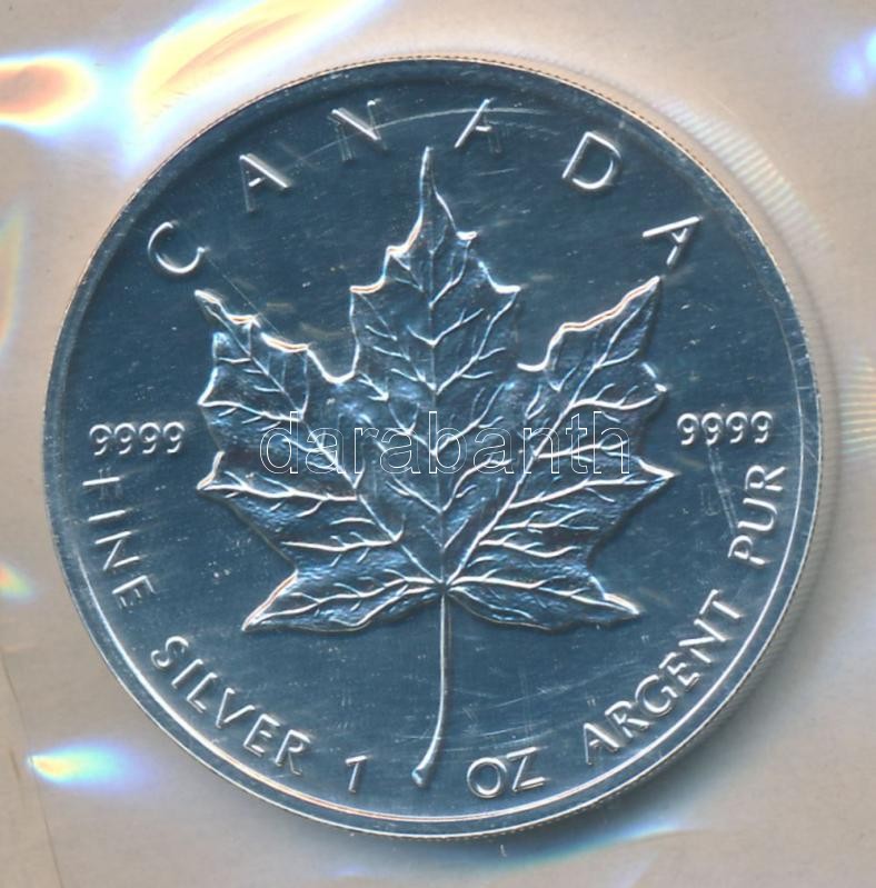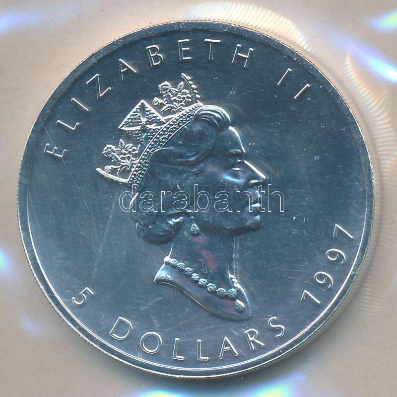 Description: Kanada 1997. 5$ Ag "II. Erzsébet / Juharlevél" (1oz/0.999) laminált fóliában T:BU