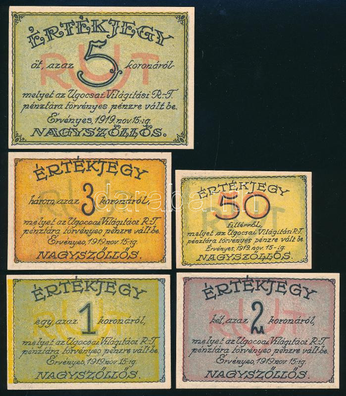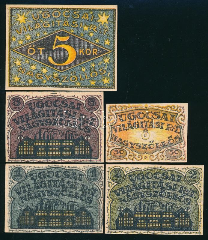 https://www.darabanth.com/en/178-Online-auction/178.0/Numismatics/Hungarian-and-foreign-emergency-notes-and-coins-tokens~600143/Nagyszollos-1919-Ugocsai-Vilagitasi-Rt-ertekjegy-50f-1K-2K-3K-5K-TI~II629430