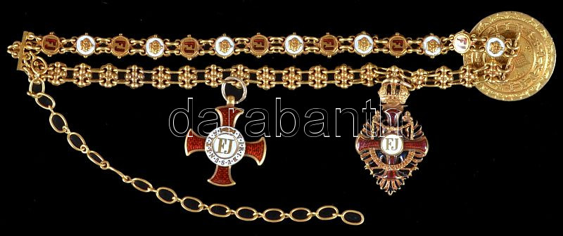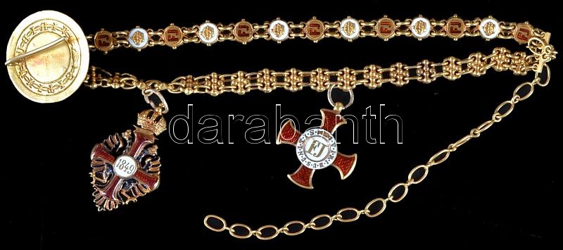 Description: ~1850. Díszes arany gomblyukjelvény (Au/18Kt) aranyláncra fűzött zománcozott "Ferenc József-rend Lovagkereszt" és "Ferenc József-rend Arany Érdemkereszt" miniatűrrel! A láncszemek között "Korona" és "FJ" díszítményekkel, a gombjelvényen "VIRIBUS UNITIS" körirattal. Teljes függesztett nagyság 21cm T:1 RRR!