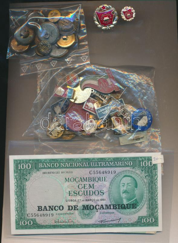Vegyes jelvény, kitűző, egyenruha gomb (12db) és bankjegy tétel, közte...