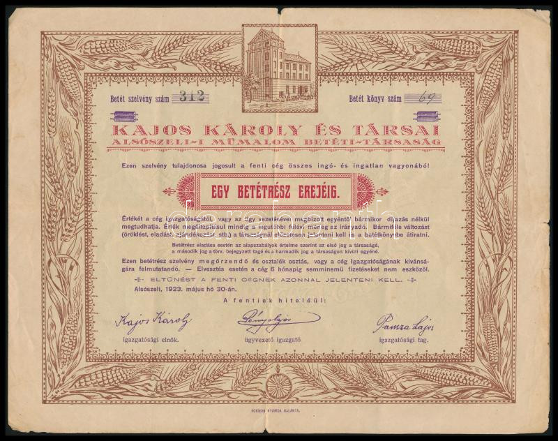 Alsószeli 1923. Kajos Károly és Társai Alsószeli-i Műmalom Betéti Társaság" betétrész szelvény T:III