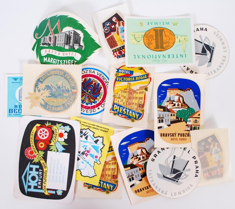 17 db bőröndcímke és szállodacímke, több országból (főleg szlovák, cseh, szerb)/ Suitcase and hotels labels from Slovakia