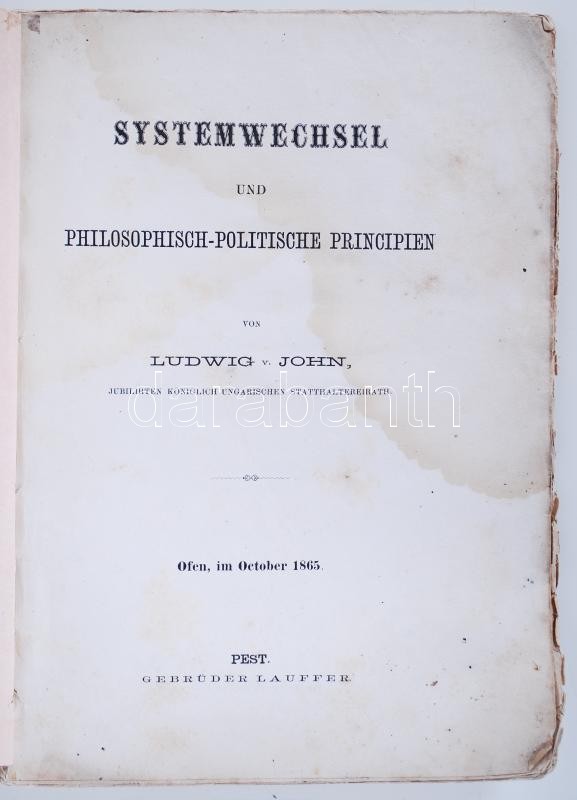 Ludwig von John: Systemwechsel und philosophisch-politische Principien. Pest, 1865, Gebrüder Lauffer, 53p.
