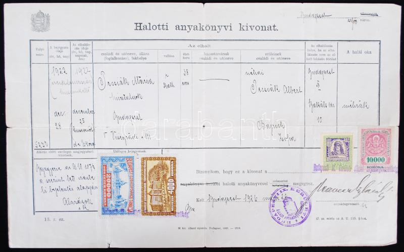 1926 Budapest Székesfővárosi Tanács illetékbélyegek okmányon