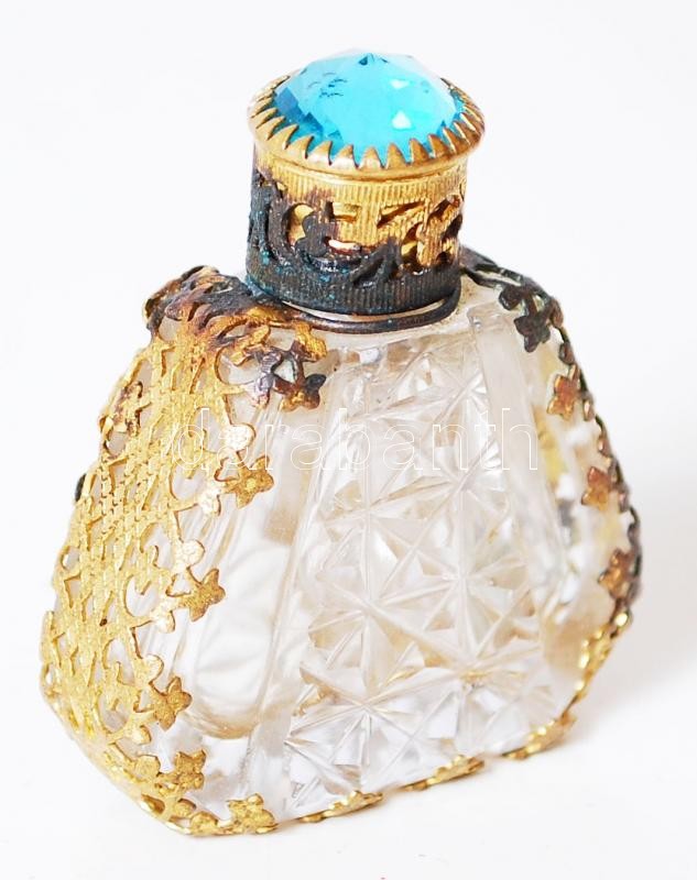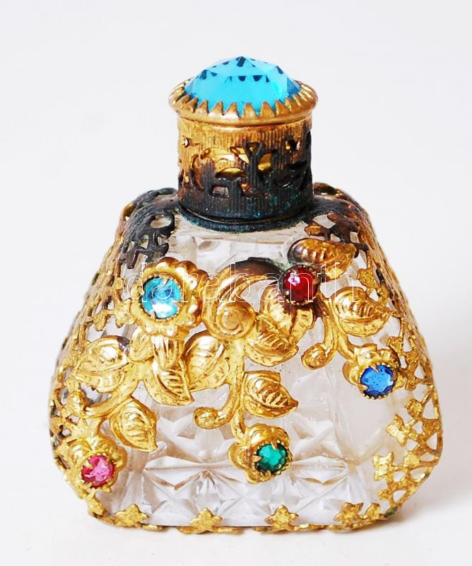 Régi parfümös üvegcse rézé és üveg díszítéssel /