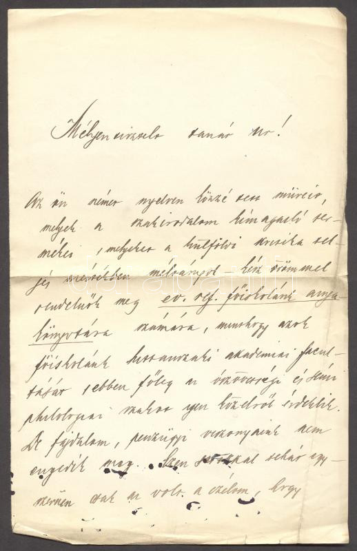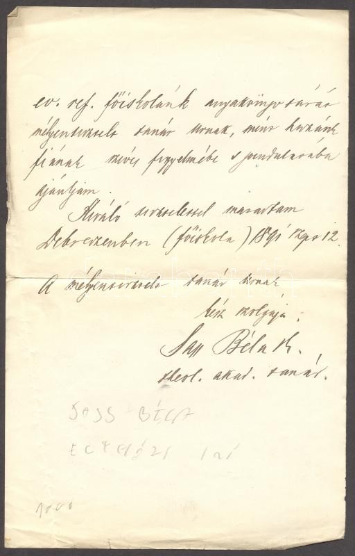 1891 Sass Béla egyházi író, egyetemi tanár Mélyen tisztelt Tanár Úr! megszólítású levele. 2 beírt oldal